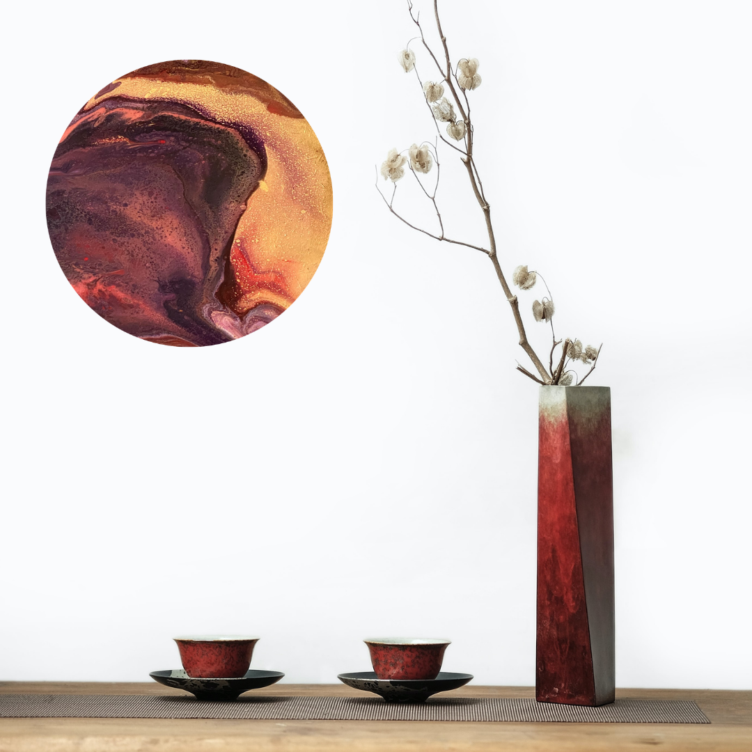 Deze abstracte ronde creatie is een uniek handgeschilderd kunstwerk. Het design is opgezet met hoogwaardige acryl verf dat door de kunstenares zelf gemengd wordt met diverse kleurpigmenten. En het is afgewerkt met meerdere lagen professionele high gloss epoxy om extra diepte en een luxe look te creëren.