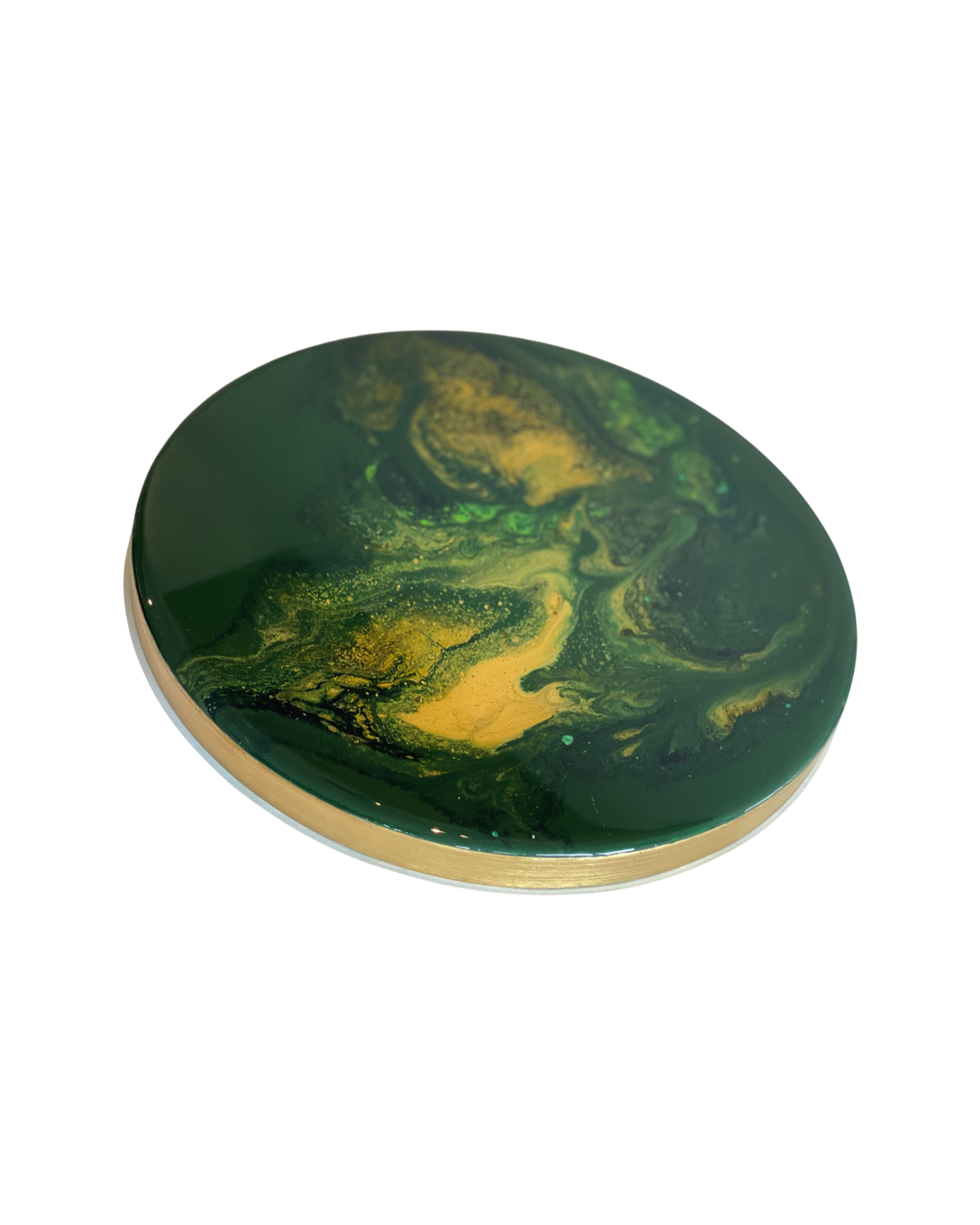 Acryl creatie met epoxy topcoat gemaakt op een messing plateau. Kan decoratief aan de wand gehangen worden maar ook op een standaard geplaatst worden om neer te zetten. Afmeting met standaard: 30 x 40cm.