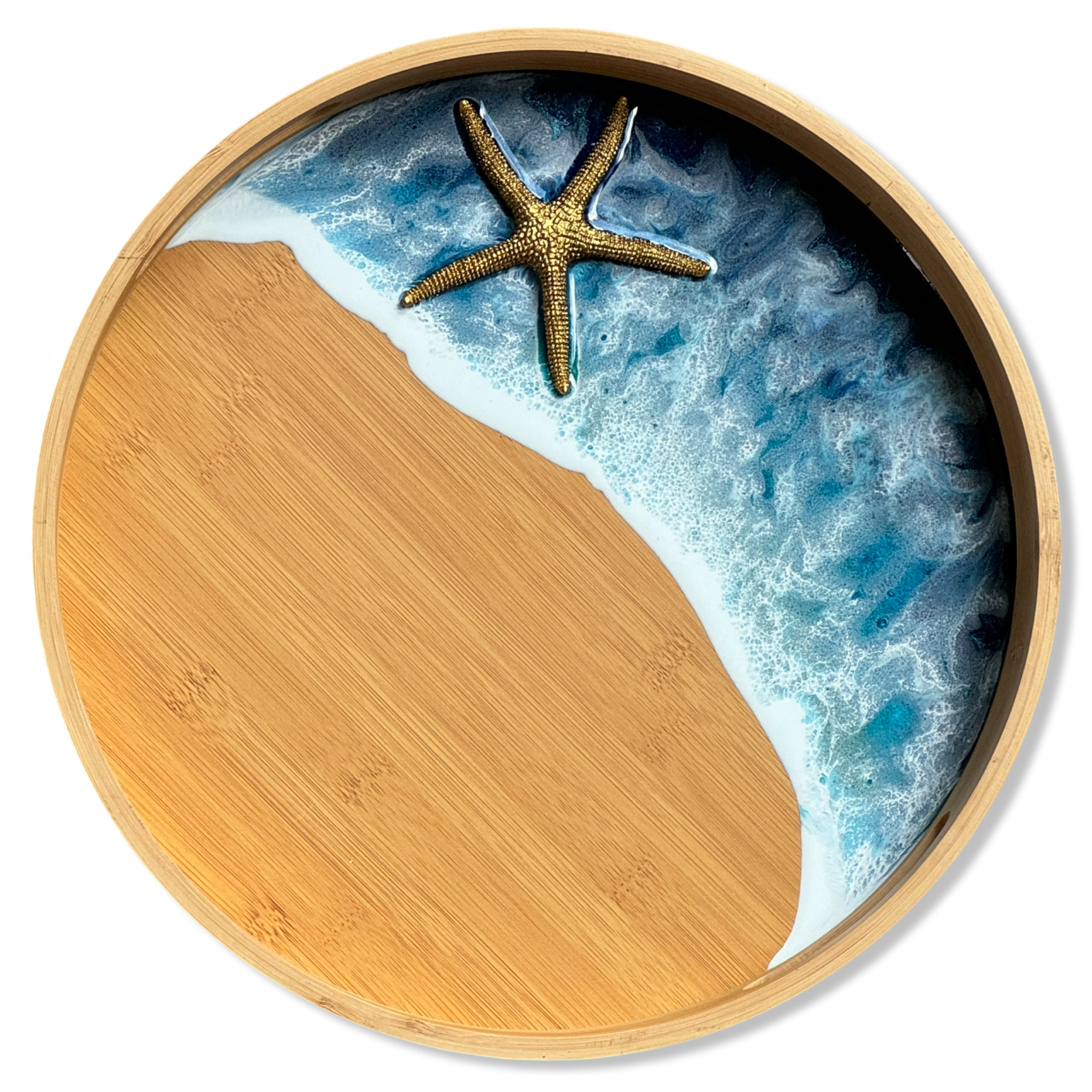 Afmetingen: Ø 35 cm. Houten dienblad met epoxy versiering.