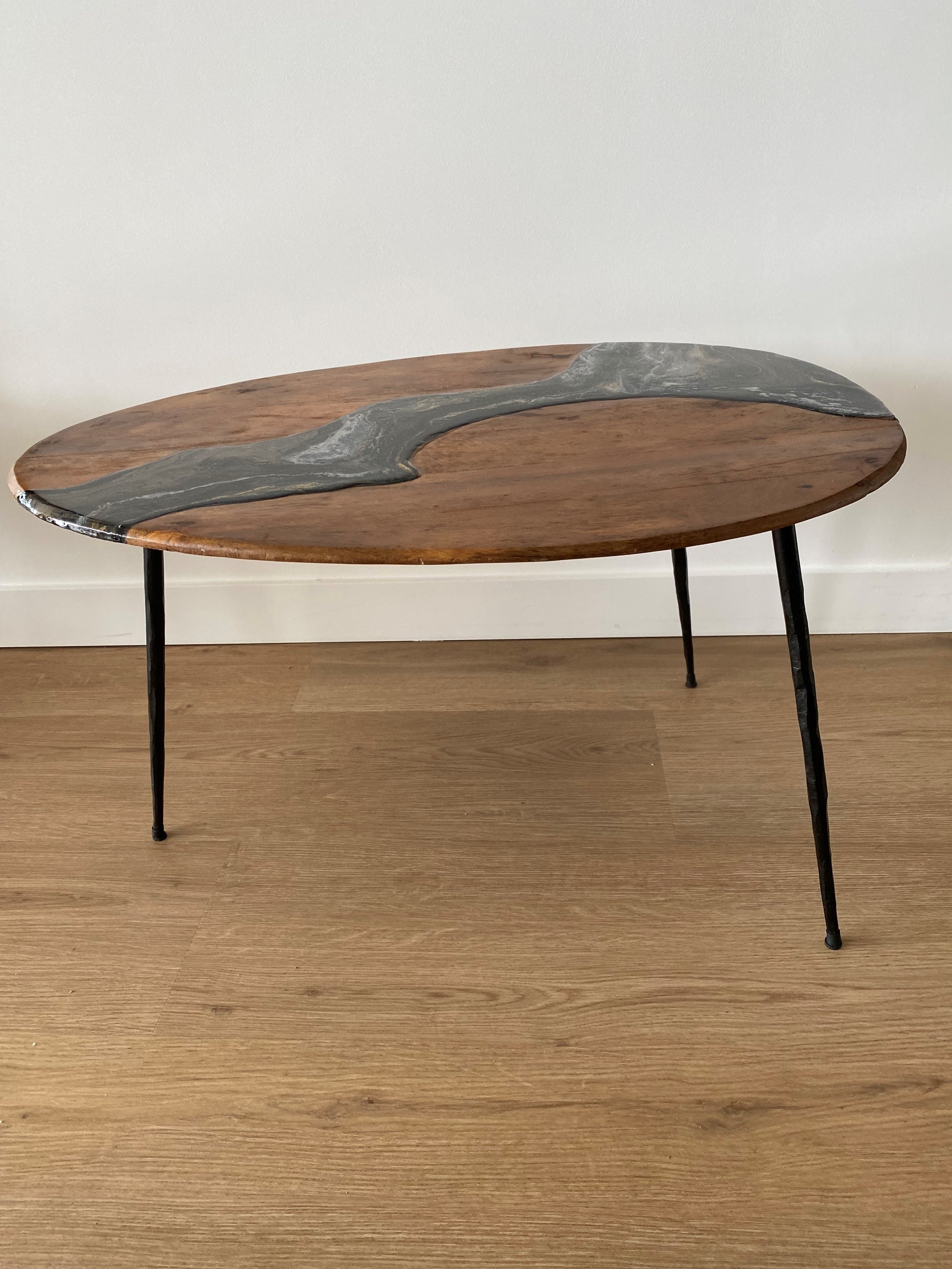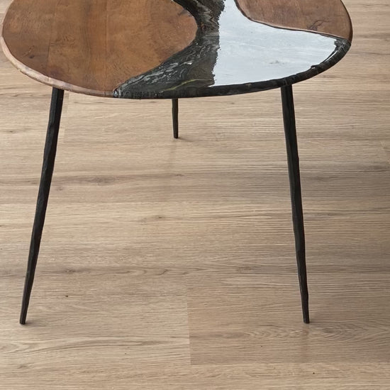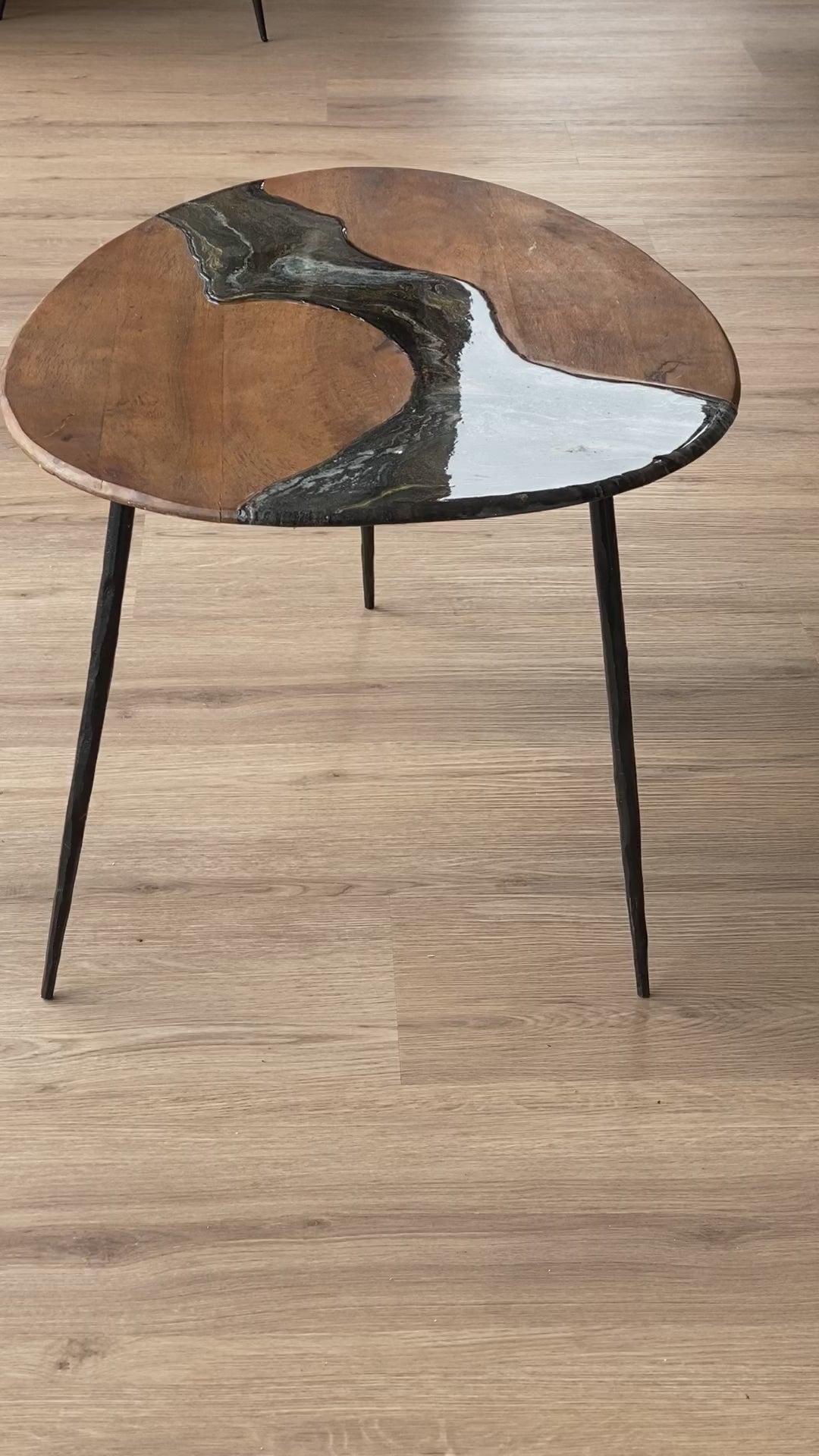 De tafel is met de hand beschilderd en vervolgens afgegoten met een glanzende laag epoxy om extra diepte en glans te creëren. Afmeting: 70x50x40 cm