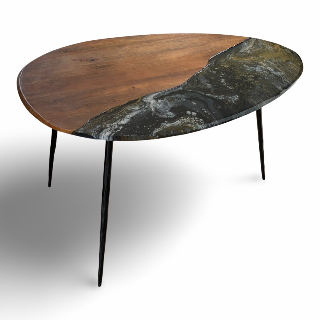 De tafel is met de hand beschilderd en vervolgens afgegoten met een glanzende laag epoxy om extra diepte en glans te creëren. Afmeting: 70x50x40 cm