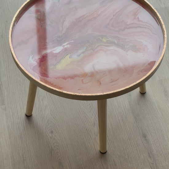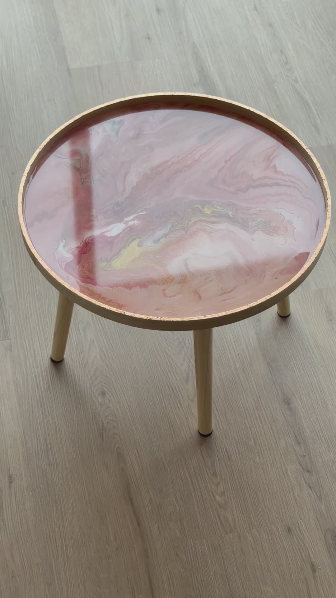 Het tafelblad van de tafel is beschilderd met hoogwaardige acrylverf en vervolgens afgegoten met meerdere lagen transparante epoxy voor een glanzende glamour look.