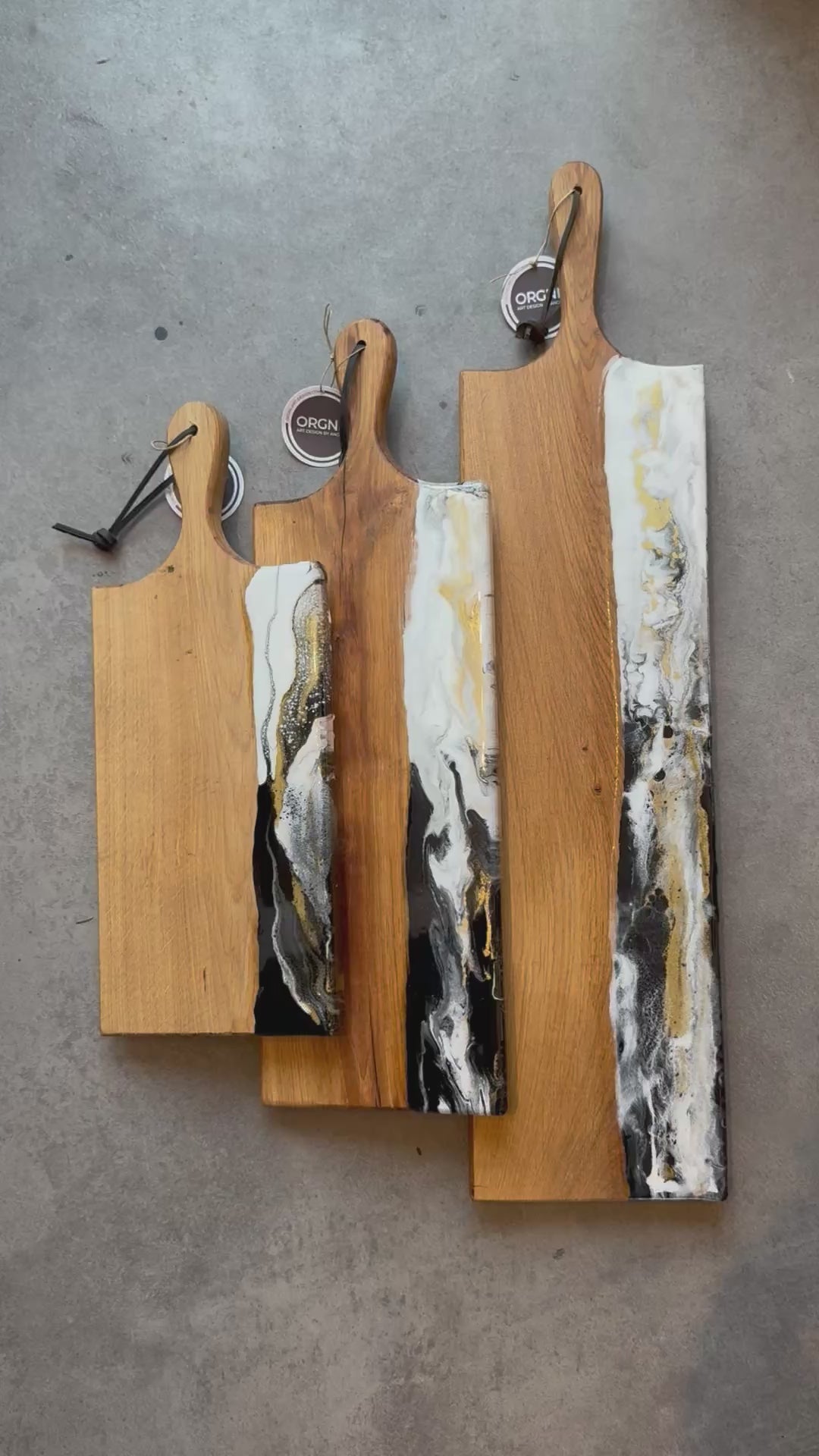 Afmeting is 50 x 20 x 2,5 cm. Robuuste eikenhouten borrelplank op 2 voetjes verfraaid met epoxy versiering. Foodsafe en 10 jaar garantie.