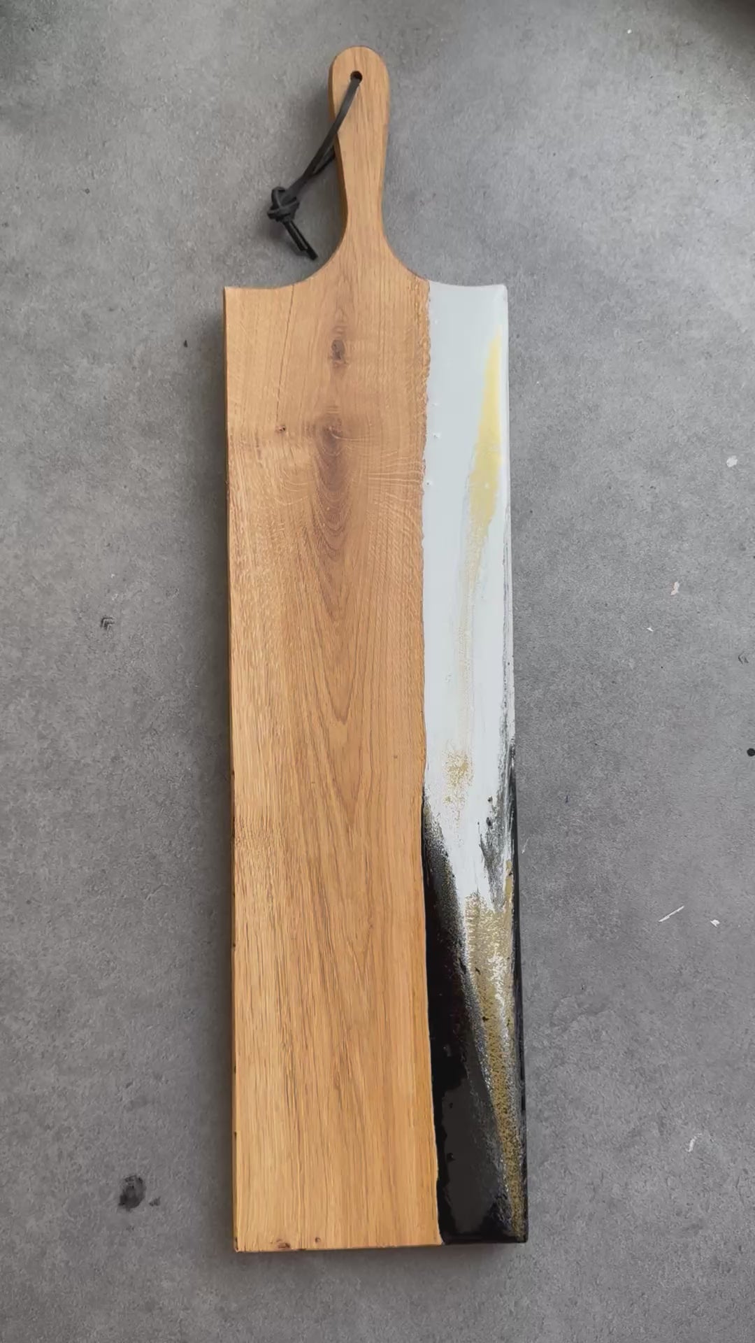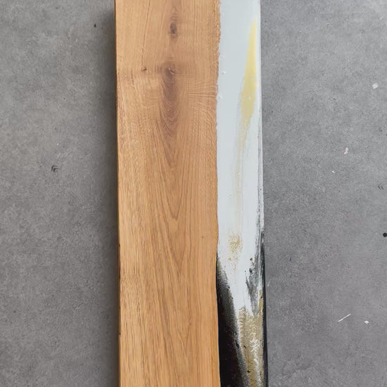 Afmeting is 60 x 20 x 2,5 cm. Wit, zwart, goud. Robuuste eikenhouten borrelplank op 2 voetjes verfraaid met epoxy versiering. Foodsafe.