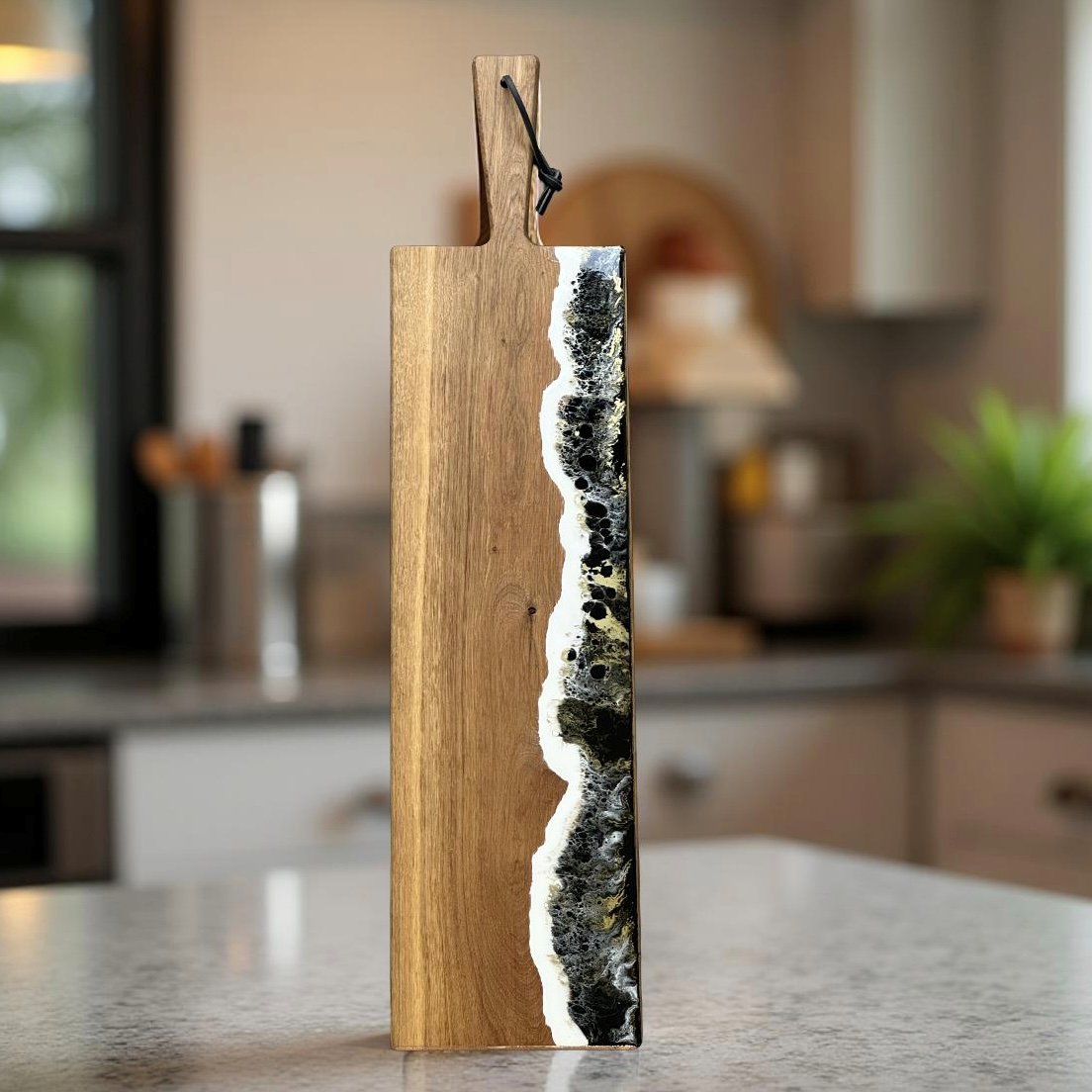Afmeting is 80 x 20 x 2,5 cm. Zwart, wit, goud. Robuuste eikenhouten borrelplank op 2 voetjes verfraaid met epoxy versiering. Foodsafe en 10 jaar garantie.