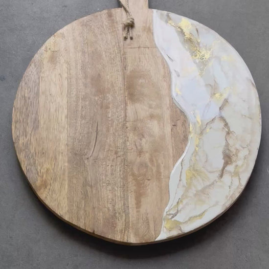 Deze luxe ronde houten borrelplank met epoxy versiering is bedoelt voor het feestelijk presenteren van lekkere hapjes op tafel maar ook om decoratief in de keuken te plaatsen. Alle borrelplanken zijn uniek en ambachtelijk gemaakt en stuk voor stuk echte blikvangers voor op tafel.