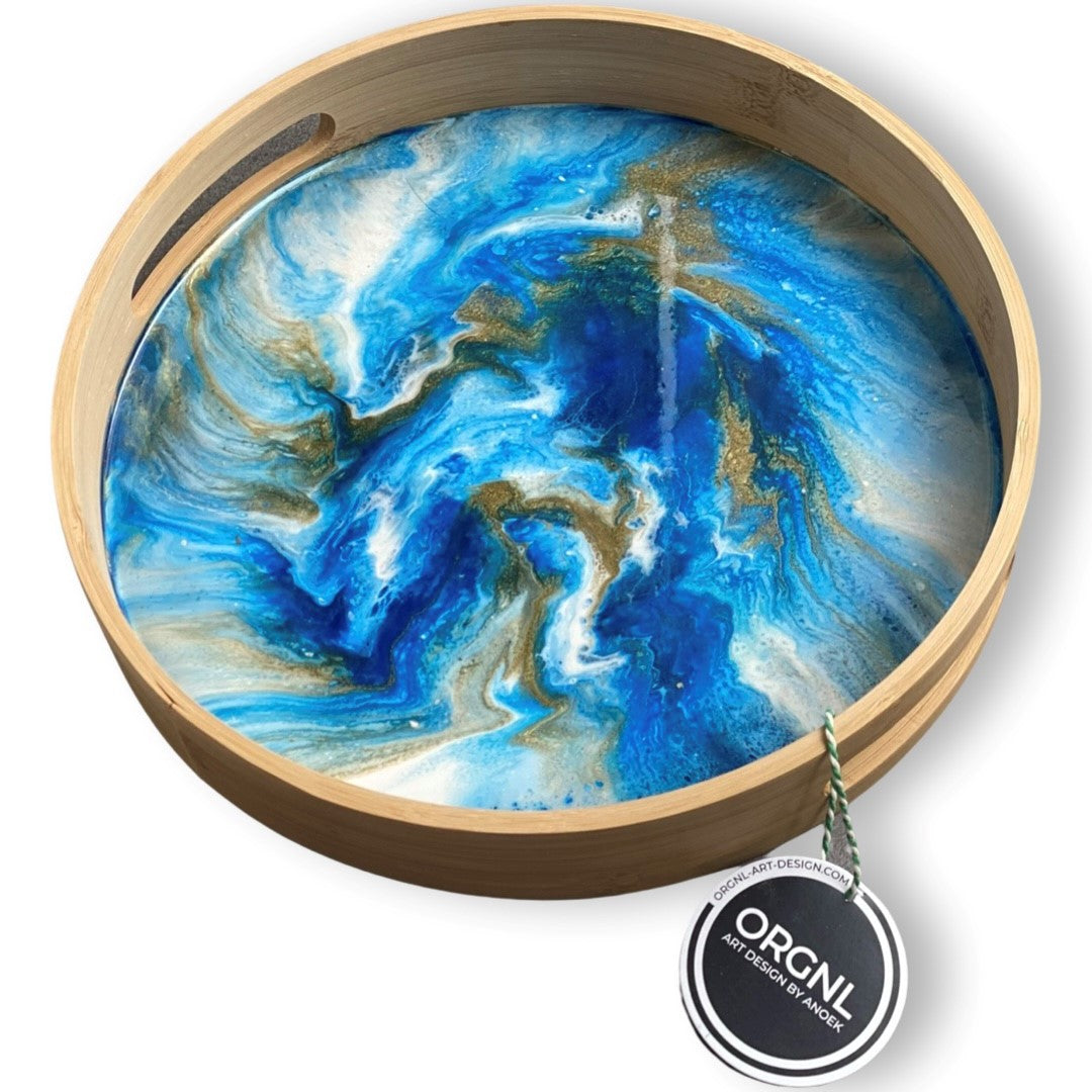 Afmetingen: Ø 30 cm. Houten dienblad met epoxy versiering.