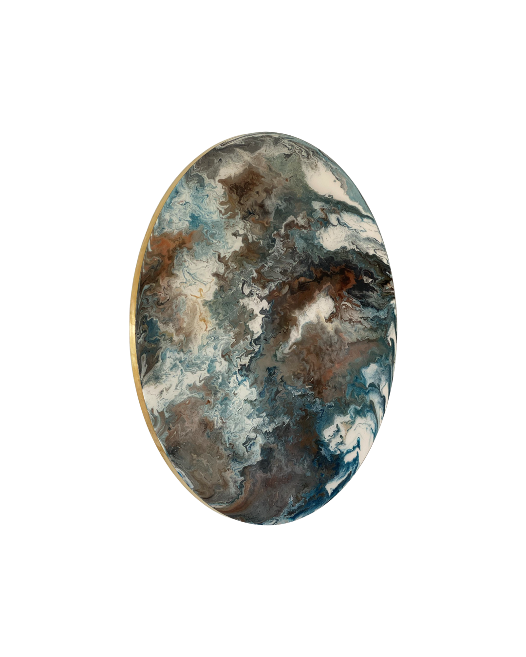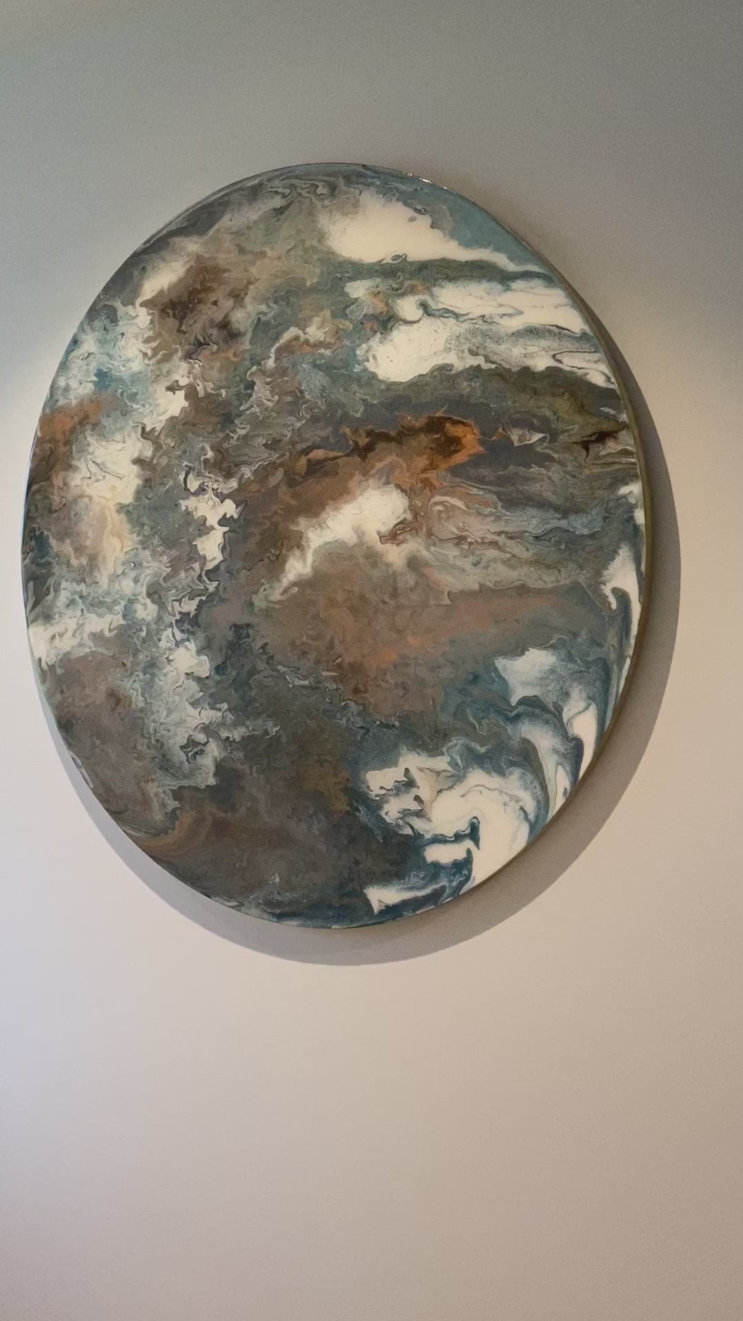 De ronde organische vorm doet de harde lijnen in een ruimte verzachten. Ook heeft een cirkel geen einde waardoor je weer een andere beleving krijgt en andere vormen ziet, wanneer je deze draait. Het kunstwerk is voorzien van een uniek professioneel ophangsysteem waardoor je het epoxy kunstwerk 360 graden kan draaien.