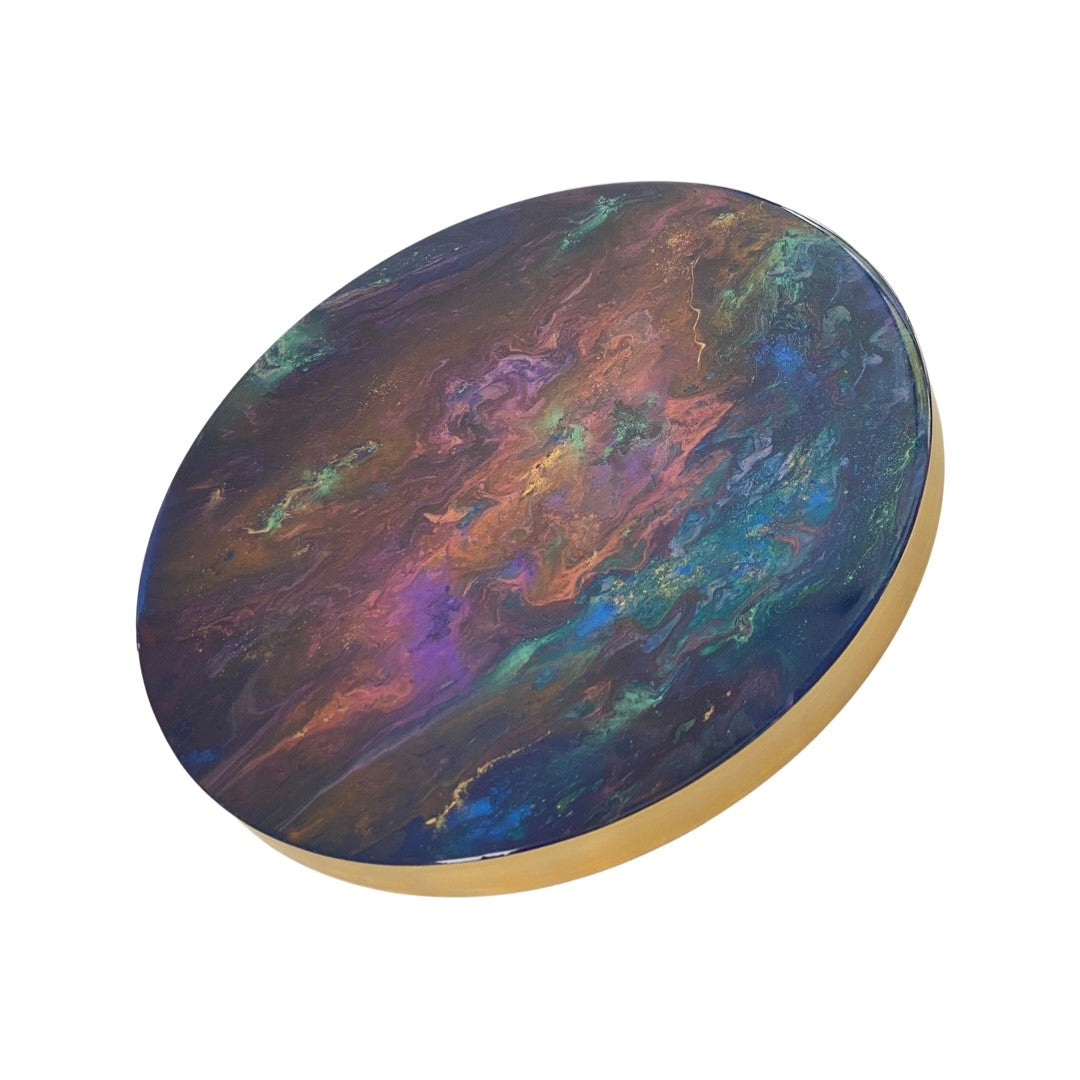 Dit kleurrijke kunstwerk is gemaakt met diverse mica kleurpigmenten en meerdere lagen epoxy om diepte en een prachtige glossy glans te creëren. Geïnspireerd door het heelal.