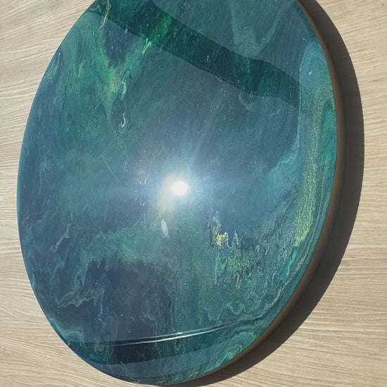 Deze abstracte ronde creatie is een uniek handgeschilderd epoxy kunstwerk. Het design is opgezet met hoogwaardige acryl verf dat door de kunstenares zelf gemengd wordt met diverse kleurpigmenten. En het is afgewerkt met meerdere lagen professionele high gloss epoxy om extra diepte en een luxe look te creëren.