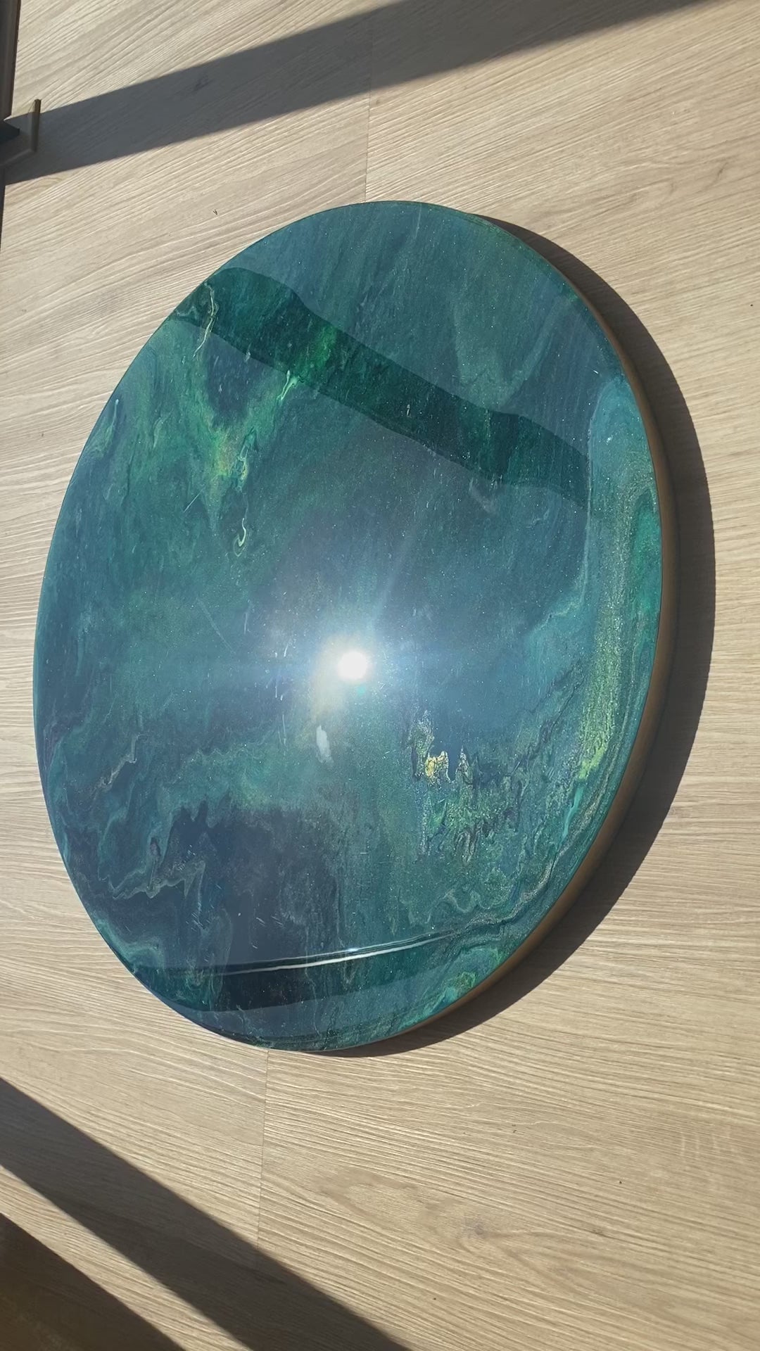 De ronde organische vorm doet de harde lijnen in een ruimte verzachten. Ook heeft een cirkel geen einde waardoor je weer een andere beleving krijgt en andere vormen ziet, wanneer je deze draait. Het kunstwerk is voorzien van een uniek professioneel ophangsysteem waardoor je het epoxy schilderij 360 graden naar wens kan draaien.