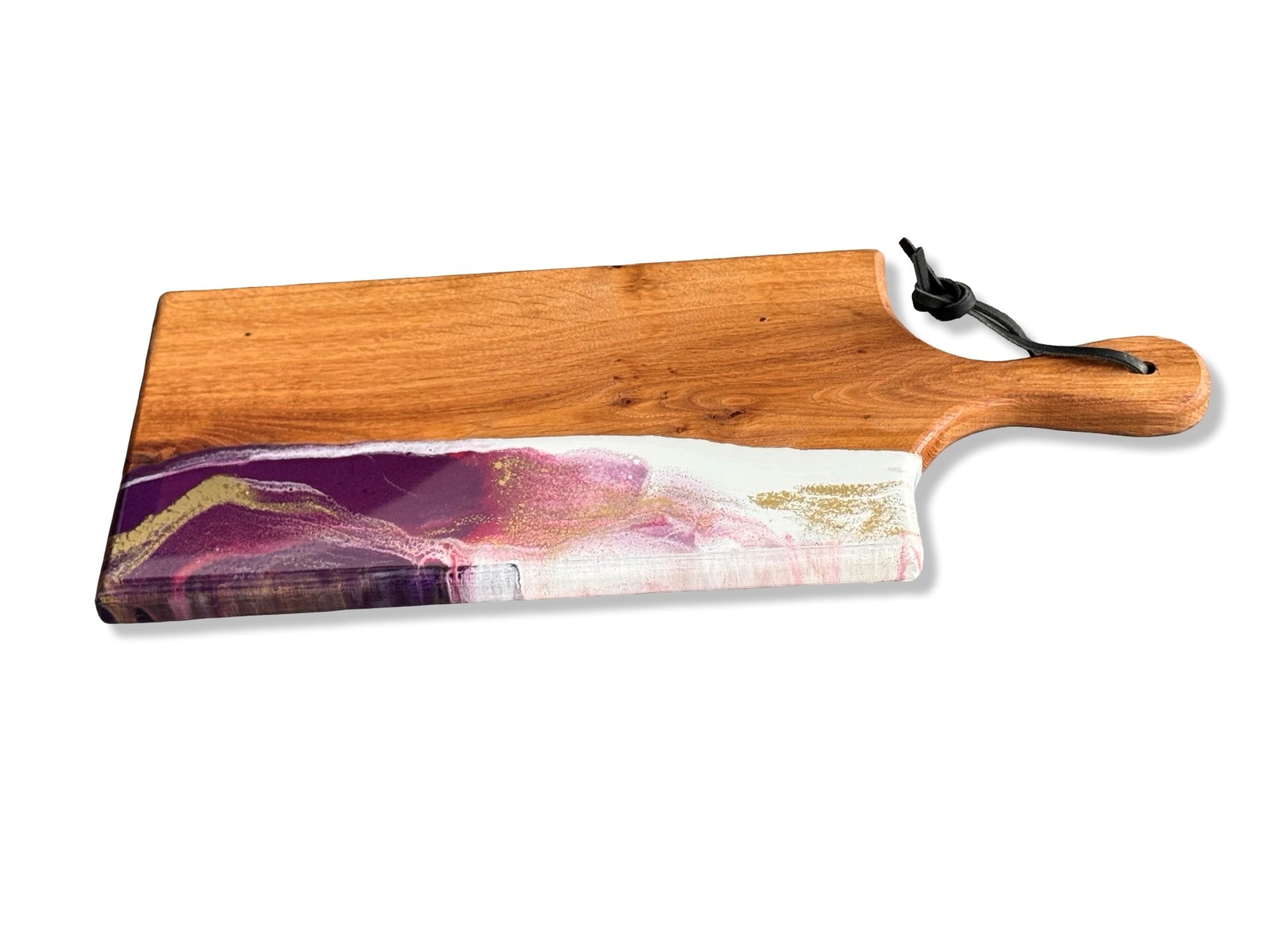 Afmeting is 50 x 20 x 2,5 cm. Robuuste eikenhouten borrelplank op 2 voetjes verfraaid met epoxy versiering. Foodsafe.