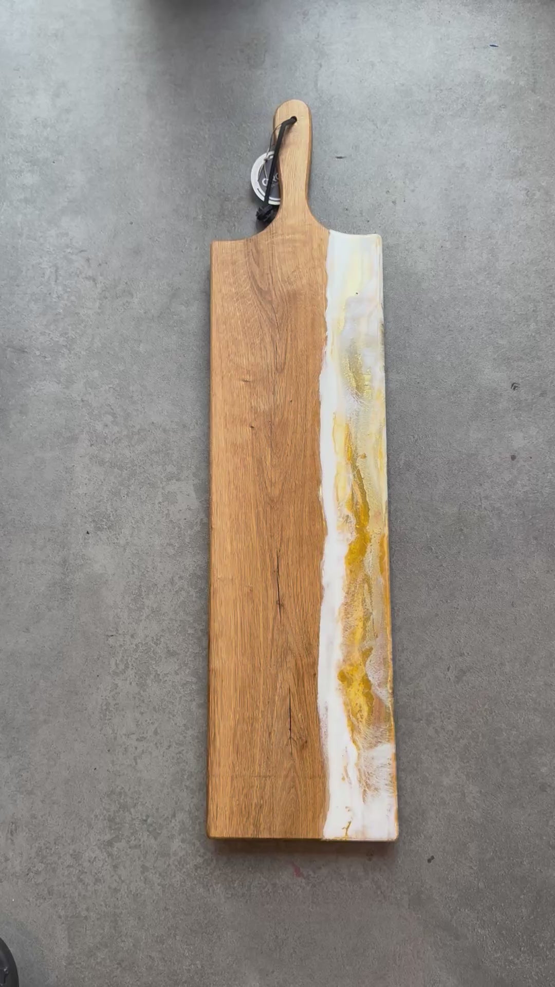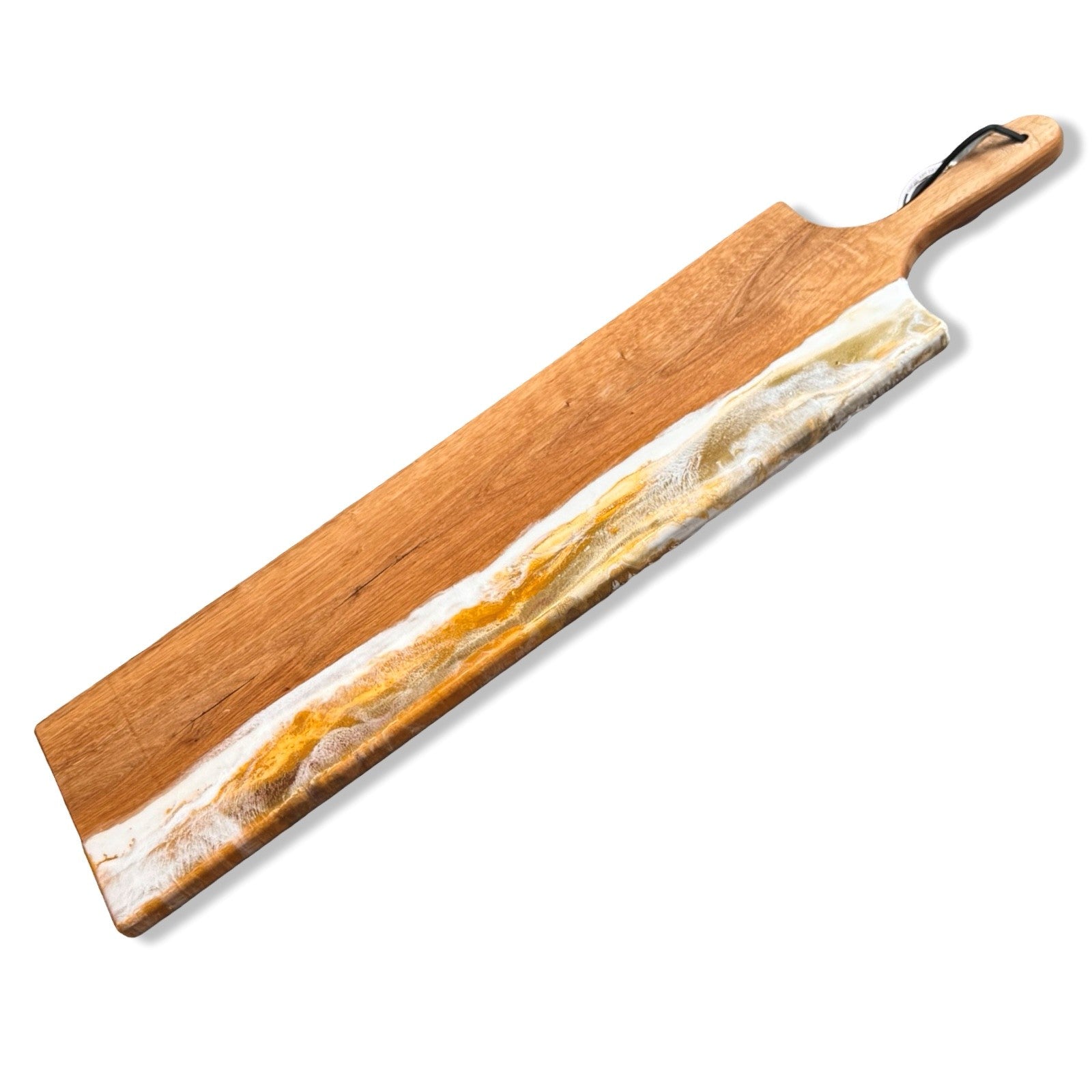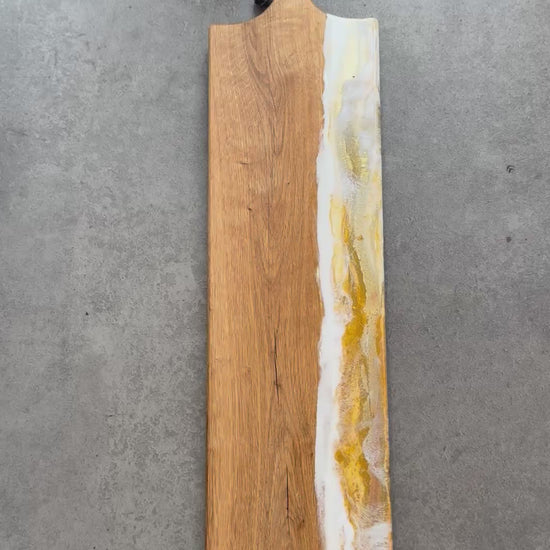 Afmeting is 80 x 20 x 2,5 cm. Oker, wit, goud. Robuuste eikenhouten borrelplank op 2 voetjes verfraaid met epoxy versiering. Foodsafe en 10 jaar garantie.