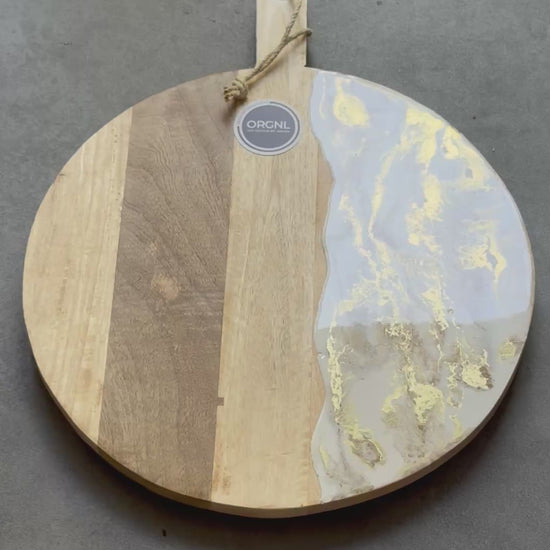 Deze luxe ronde houten borrelplank met epoxy versiering is bedoelt voor het feestelijk presenteren van lekkere hapjes op tafel maar ook om decoratief in de keuken te plaatsen. Alle borrelplanken zijn uniek en ambachtelijk gemaakt en stuk voor stuk echte blikvangers voor op tafel.