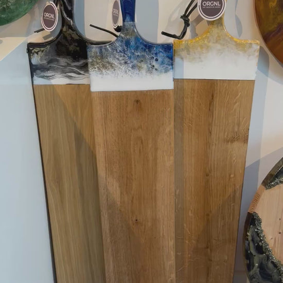 Afmeting is 95 x 20 x 2,5 cm. Robuuste eikenhouten borrelplank op 2 voetjes verfraaid met epoxy versiering. Foodsafe en 10 jaar garantie.