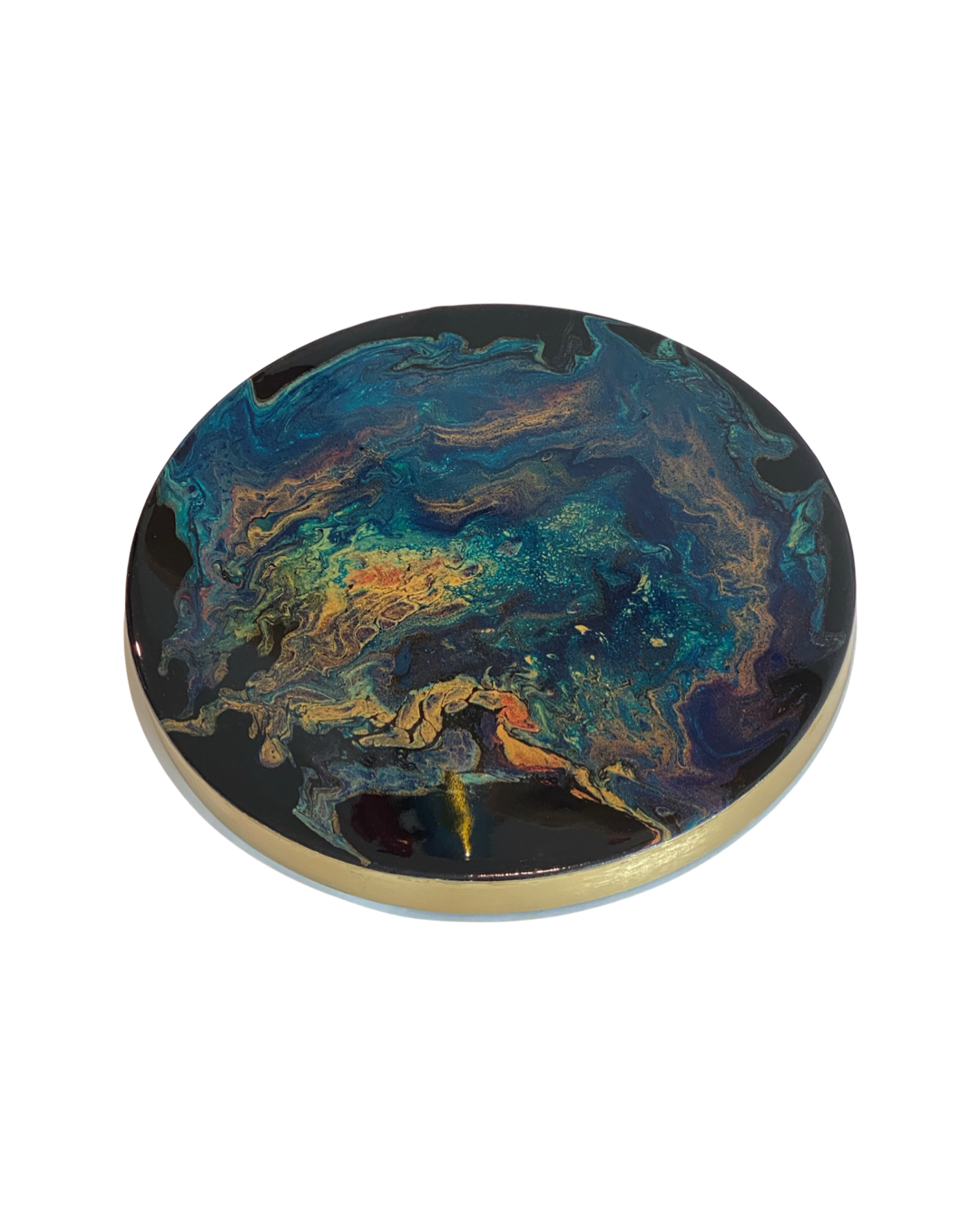 Acryl creatie met epoxy topcoat gemaakt op een messing plateau. Kan decoratief aan de wand gehangen worden maar ook op een standaard geplaatst worden om neer te zetten. Afmeting met standaard: 30 x 40cm.