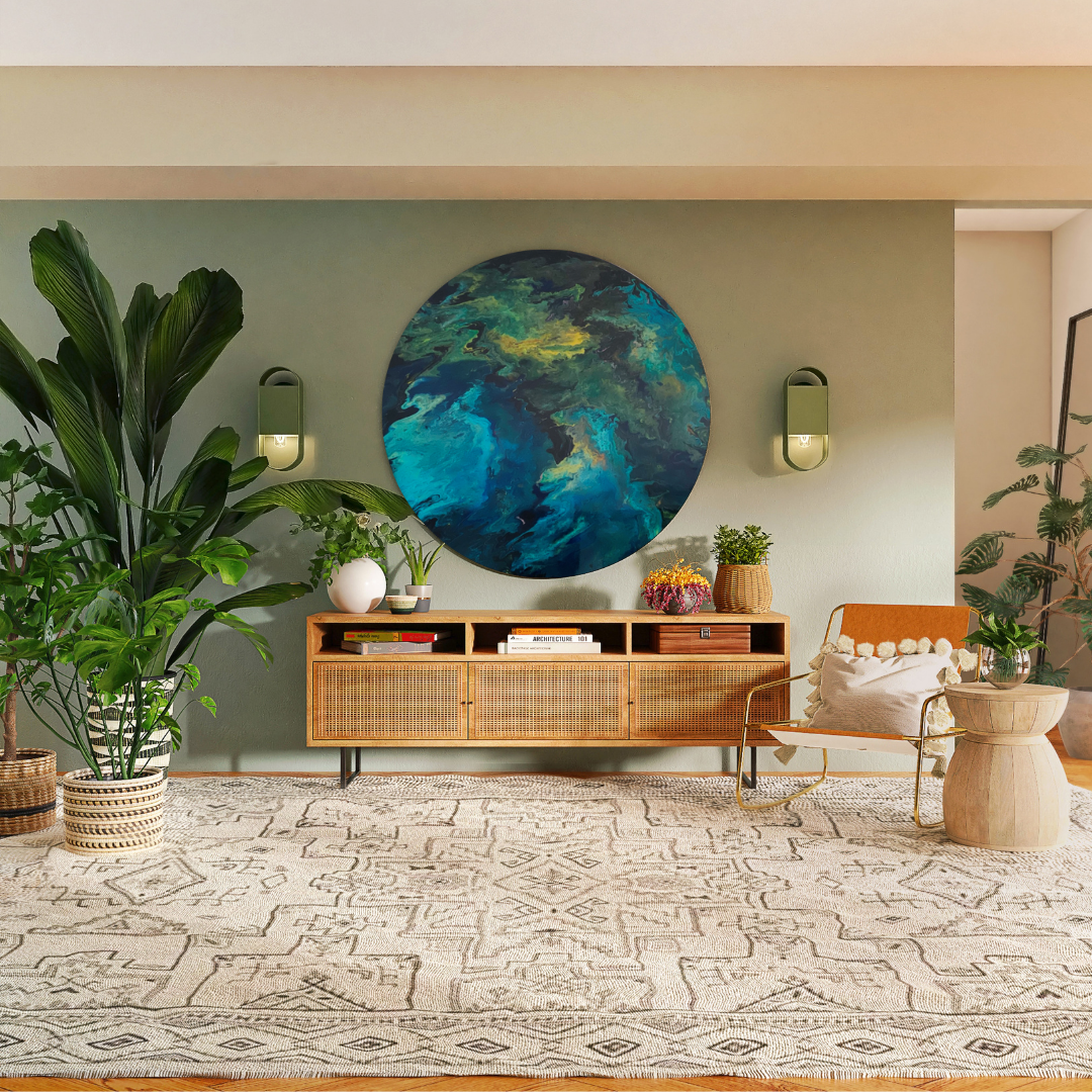 De ronde organische vorm doet de harde lijnen in een ruimte verzachten. Ook heeft een cirkel geen einde waardoor je weer een andere beleving krijgt en andere vormen ziet, wanneer je deze draait. Het kunstwerk is voorzien van een uniek professioneel ophangsysteem waardoor je het epoxy kunstwerk 360 graden kan draaien.