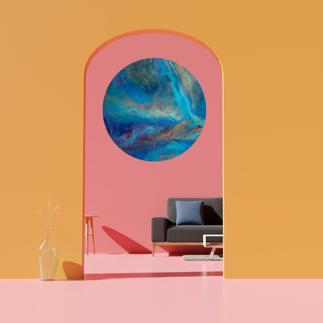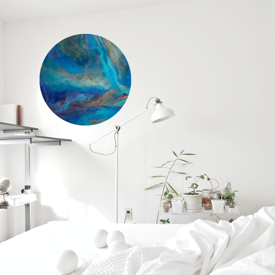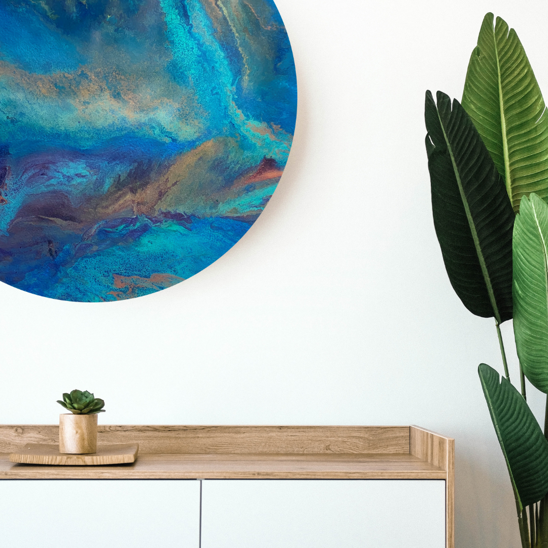 De ronde organische vorm doet de harde lijnen in een ruimte verzachten. Ook heeft een cirkel geen einde waardoor je weer een andere beleving krijgt en andere vormen ziet, wanneer je deze draait. Het kunstwerk is voorzien van een uniek professioneel ophangsysteem waardoor je het epoxy kunstwerk 360 graden kan draaien.