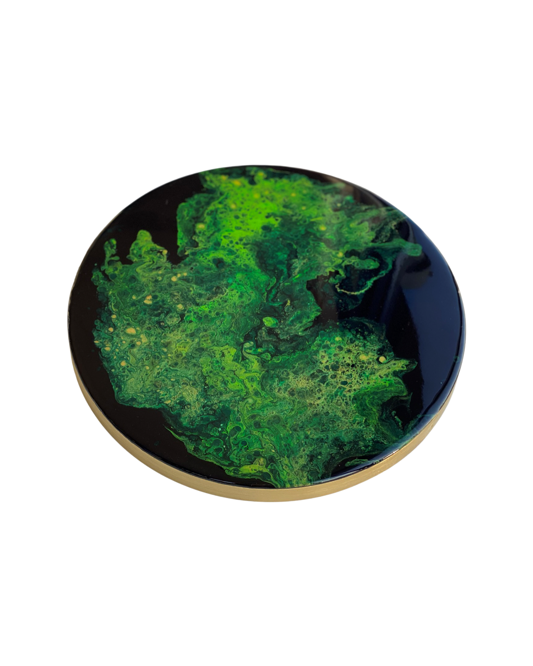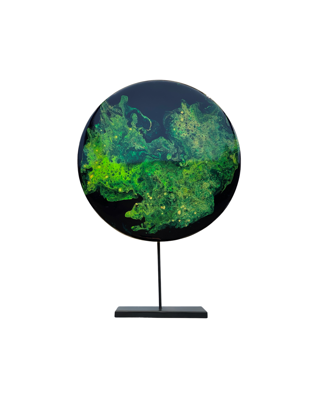 Acryl creatie met epoxy topcoat gemaakt op een messing plateau. Kan decoratief aan de wand gehangen worden maar ook op een standaard geplaatst worden om neer te zetten. Afmeting met standaard: 30 x 40cm.