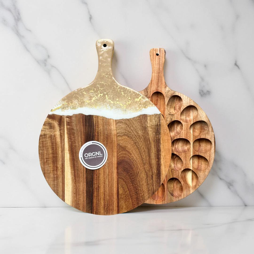 Op zoek naar een unieke borrelplank die zowel praktisch als stijlvol is? Onze handgemaakte borrelplank/eierplateau met epoxy is een echte eyecatcher!