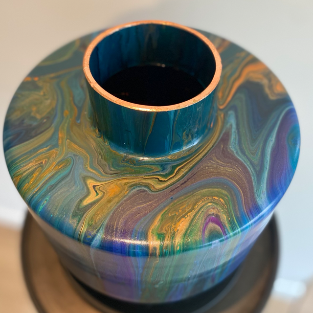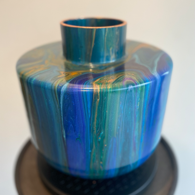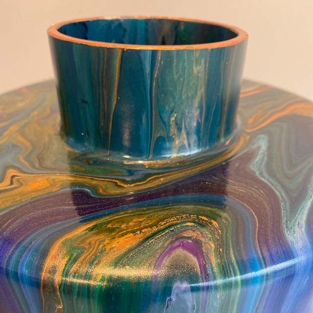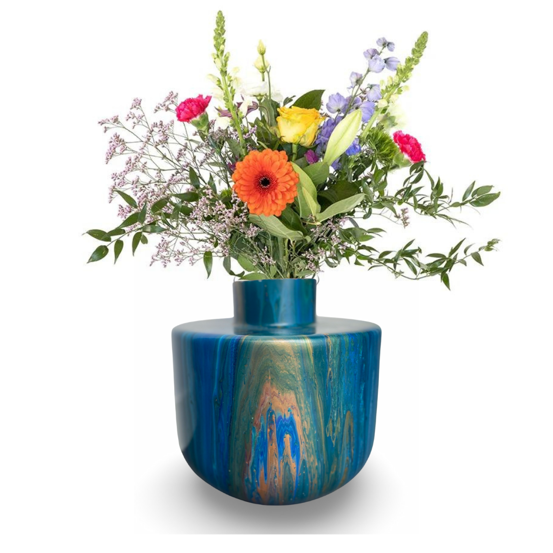 De luxe vaas is met de hand met hoogwaardige acrylverf beschilderd en daarna afgelakt met een weerbestendige vernislak. En om de vazen wat extra glamour te geven is het randje van de vaas voorzien van een laagje bladbrons.