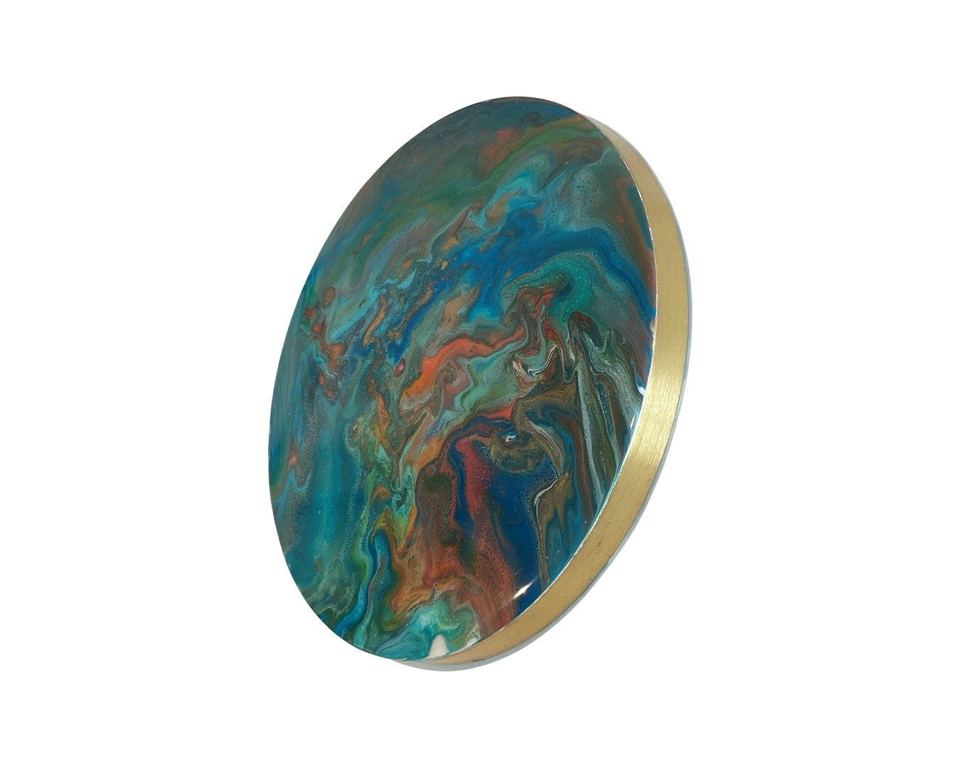 Acryl creatie met epoxy topcoat gemaakt op een messing plateau. Kan decoratief aan de wand gehangen worden maar ook op een standaard geplaatst worden om neer te zetten. Afmeting met standaard: 30 x 40cm.