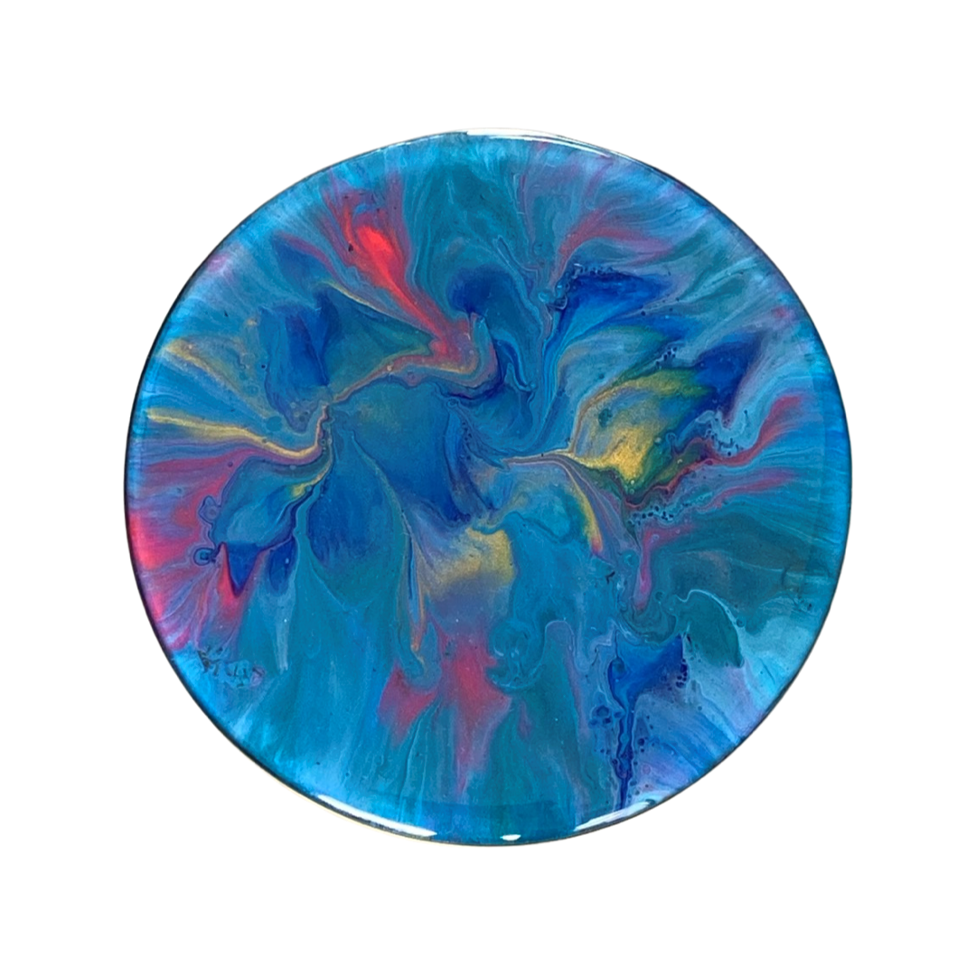 Acryl creatie met een topcoat van meerdere lagen high gloss epoxy en afgewerkt met een handgemaakte goudkleurige messing lijst.