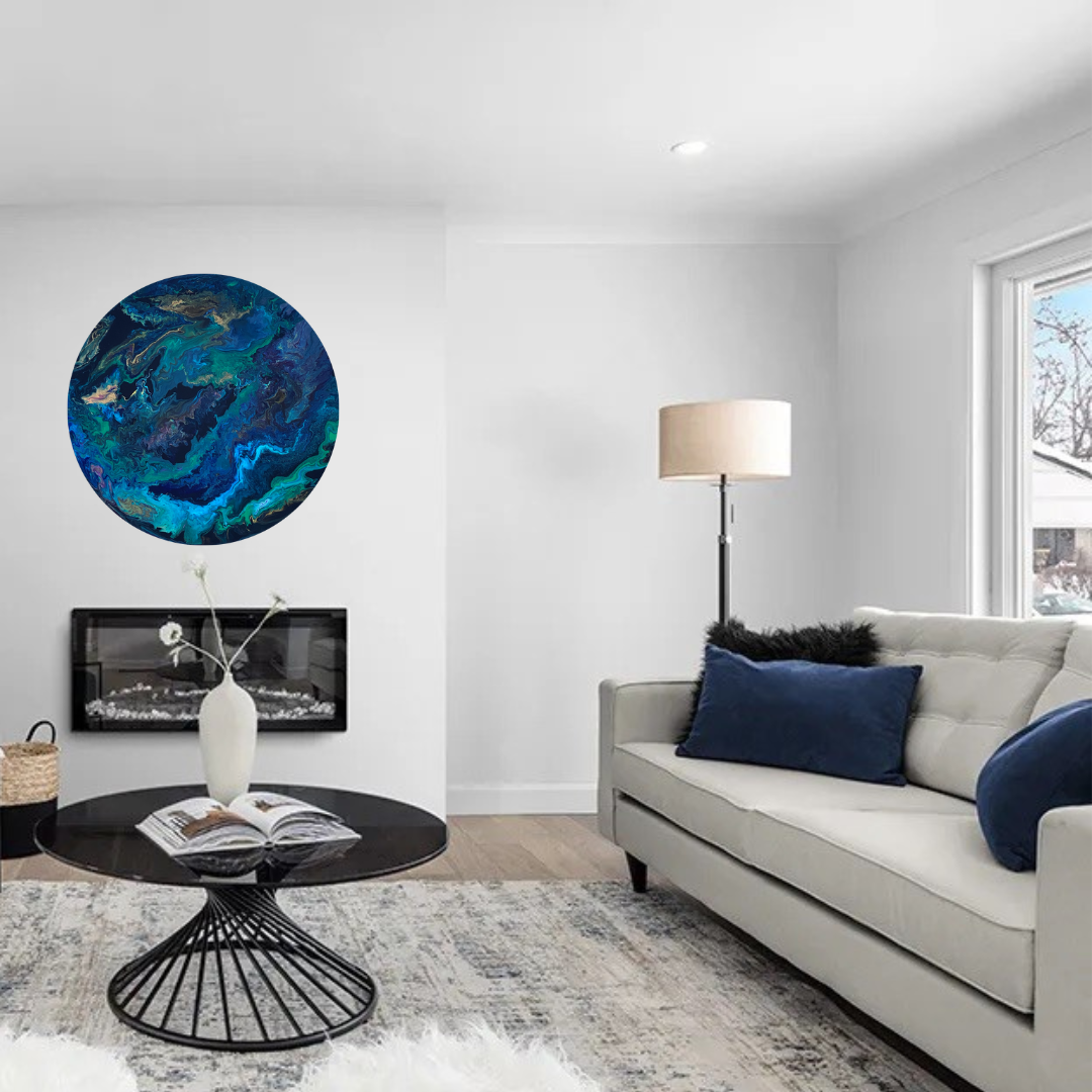 De ronde organische vorm doet de harde lijnen in een ruimte verzachten. Ook heeft een cirkel geen einde waardoor je weer een andere beleving krijgt en andere vormen ziet, wanneer je deze draait. Het kunstwerk is voorzien van een uniek professioneel ophangsysteem waardoor je het epoxy kunstwerk 360 graden naar wens kan draaien.