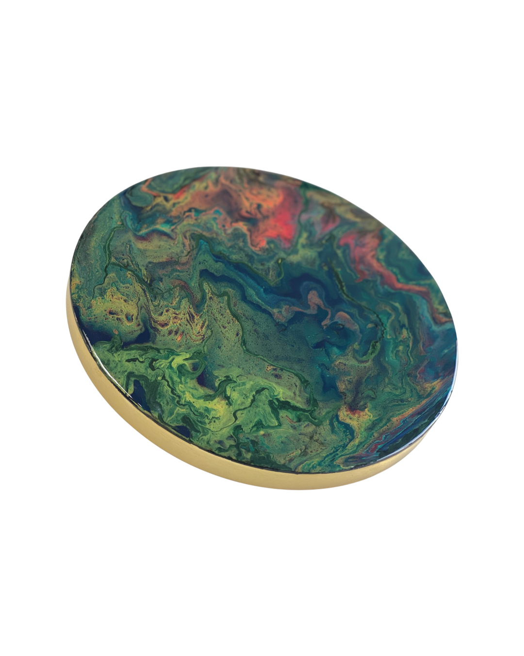 Acryl creatie met epoxy topcoat gemaakt op een messing plateau. Kan decoratief aan de wand gehangen worden maar ook op een standaard geplaatst worden om neer te zetten. Afmeting met standaard: 30 x 40cm.